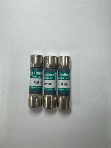 A set of three midget-style fuses from Littelfuse, each rated for 10 amps and 250 volts, commonly used in control circuits for overcurrent protection.