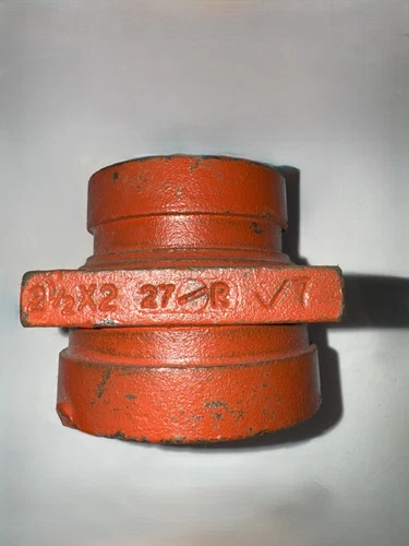 A Victaulic grooved pipe fitting that reduces the pipe size from 2-1/2″ to 2″. It is a concentric reducer, meaning the centerline of both openings is the same.