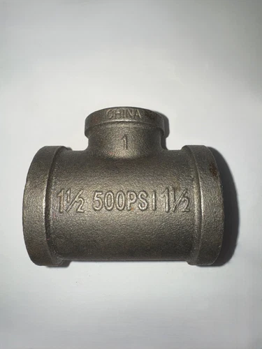 A reducing tee fitting with 1-1/2″ female threads on the run and a 1″ female thread on the branch outlet, rated for 500 PSI.